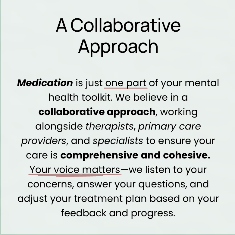 Medication management is about handing out prescriptions. It’s about ... evaluating your symptoms, and creating a plan that integrates seamlessly with your therapy and lifestyle goals.